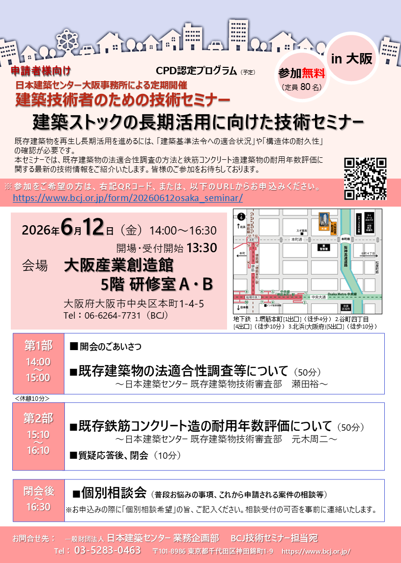 建築技術者のための技術セミナー in 大阪 (無料)「建築ストックの長期活用に向けた技術セミナー」の開催(6/12)について
